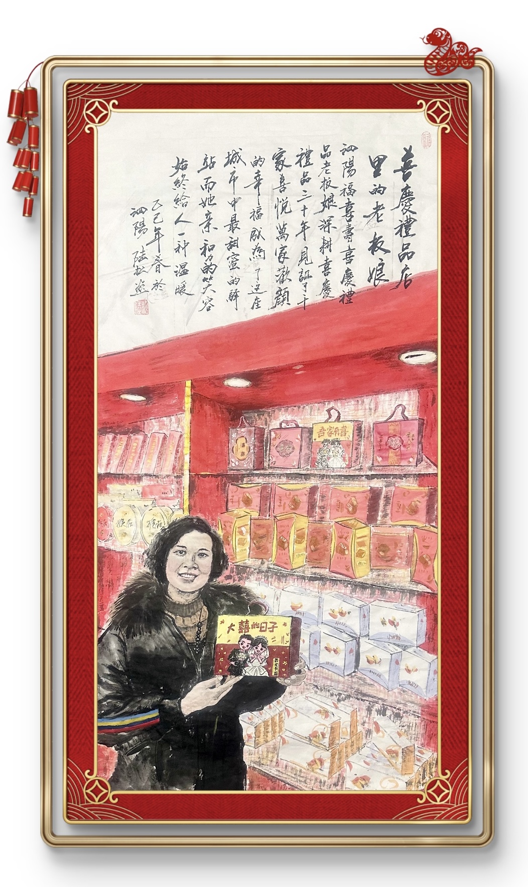 2024年,在县统战部组织的一次活动中,他重遇书画界友人,被邀约后,正式回归艺术圈,积极参与书画展览与创作,值福喜寿喜庆礼品成立三十周年之际,他创作的国画作品《喜庆礼品店里的老板娘》,2025年入展市里举办的书画展览。